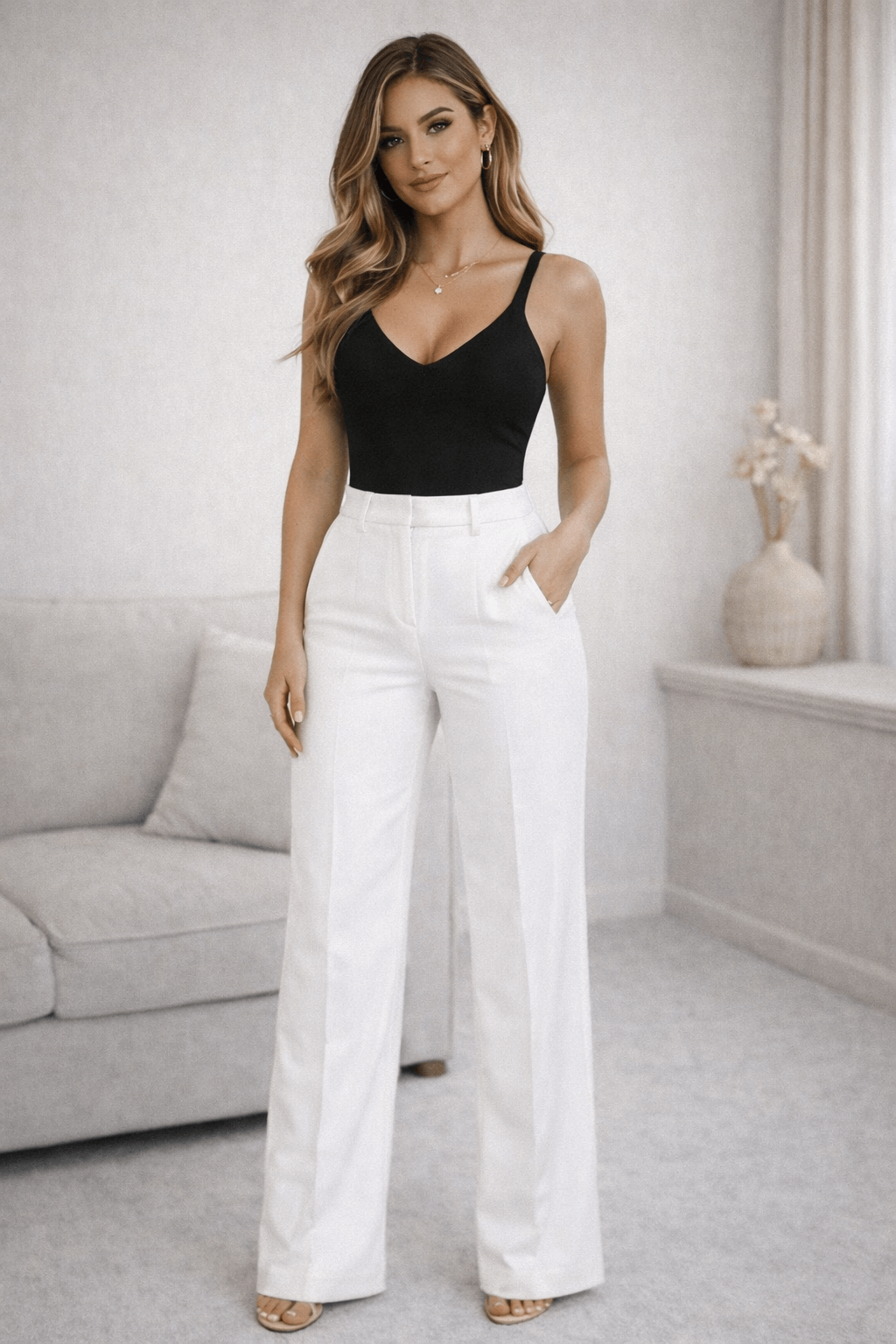 Pantalón talle alto con diseño estructurado y detalle de cierre. Perfecto para combinar con tops o blusas ajustadas. Su silueta favorece y alarga la figura.
